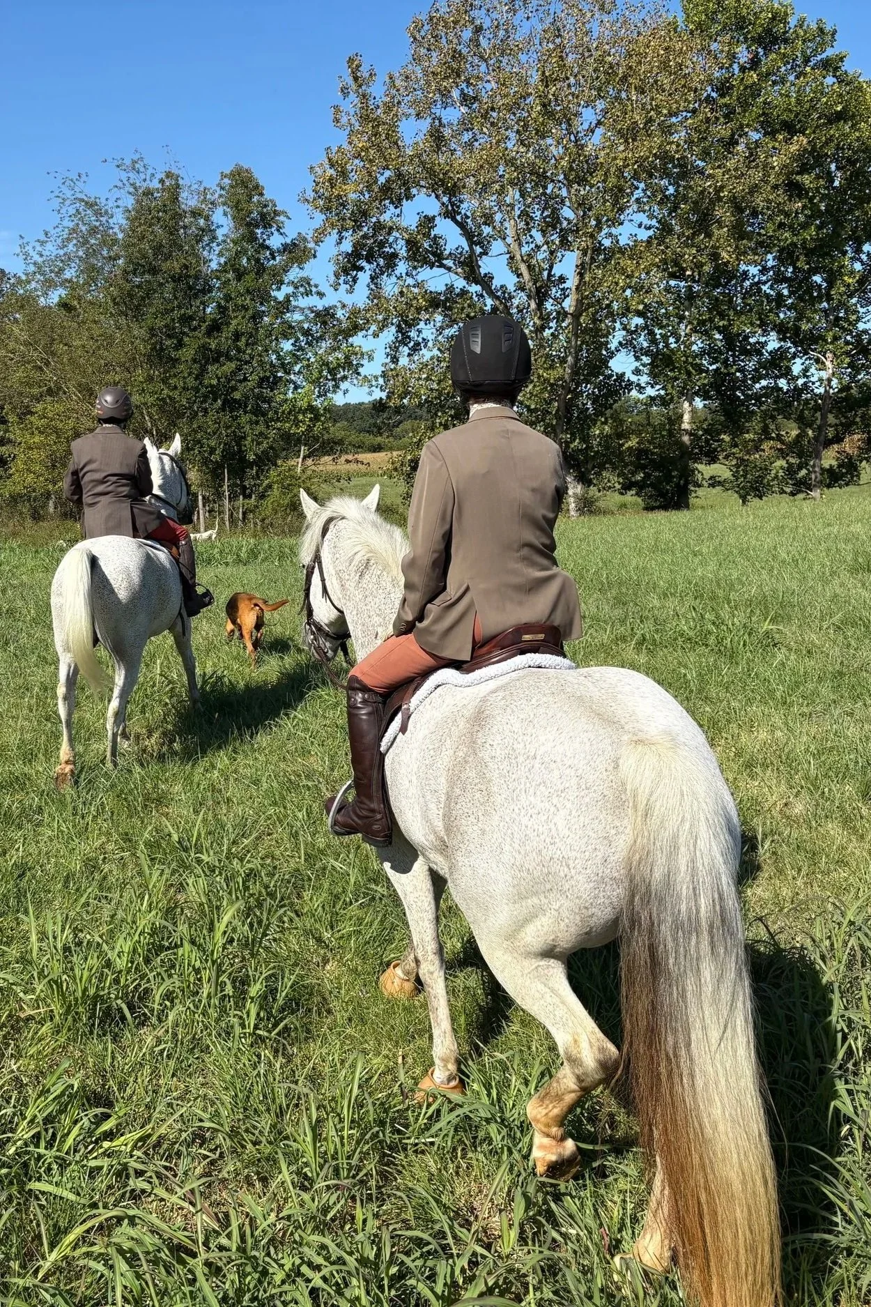 Wear darker colors: Red (scarlet) coats are reserved for our staff and members who are managing the hounds and leading the flights.